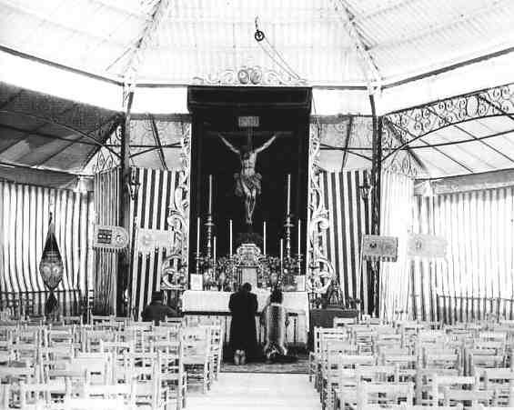 | JULIO DOMINGUEZ ARJONA 1 de Abril de 2005 Si hubiera un concurso de carteles de los cienes y cienes, de los mieles y mieles, que se celebran en peñas, distritos y tertulias, para representar ese transito de la Semana Santa a la Feria, este seria el ganador. Es como una foto sicologica de lo que tienen ahora mismo muchos sevillanos en la cabeza. Es un fundido encadenado de planos, donde se entrecruzan las imagenes de la reciente Semana Santa que se va desdibujando en nuestro recuerdos y de pronto se van enfocando imagenes de una Feria que ha de venir .- Un Cristo tan emblemático como el de los Estudiantes y una caseta con sus lonas rayadas , las silla de enea y ......contemos la historia desde el principio de esta joya gráfica .- Estamos en 1965, se celebraban las Misiones Generales ( este año ha habido algunos que por celebrar efemerides , hasta las han celebrado con diez años de antelacion y se han pegado un pechá anda increible ) El Cristo de la Buena Muerte estuvo en la Zona 10º (Porvenir), Centro nº 4, Caseta del Círculo de Labradores , en los terrenos de la Feria de Sevilla entronces en le Prado de San Sebastian .- Esta caseta era la única de la entonces Feria del Prado que estaba permanentemente montada desde 1954 . Tenia una estructura fija todo el año, consistente en un semisotano y una bella estructura metálica, a modo de merendero gigante , que era cubierta con las caracteriticas lonas a rayas , que en su dia fue trasladada a Club de Campo de Sevilla Curiosamente, el Real Circulo de Labradores , acogió también la imagen del Cristo de las Misericordias de Santa Cruz que presidió sus instalaciones deportivas del Círculo en Los Remedios. Se ven perfectamente los primitivos guiones de las facultades "históricas" (de izquierda a derecha: Ciencias, Filosofía, Derecho y Medicina,) estrenados entre 1959 y 1961 y el estandarte de la corporación (1941) antes de agregársele el remate de la cruz patriarcal (1978). De una viga de la estructura pende una carrucha que probablemente se utilizara para el montaje del altar.- Posiblemente alguien le traicione su meten y
