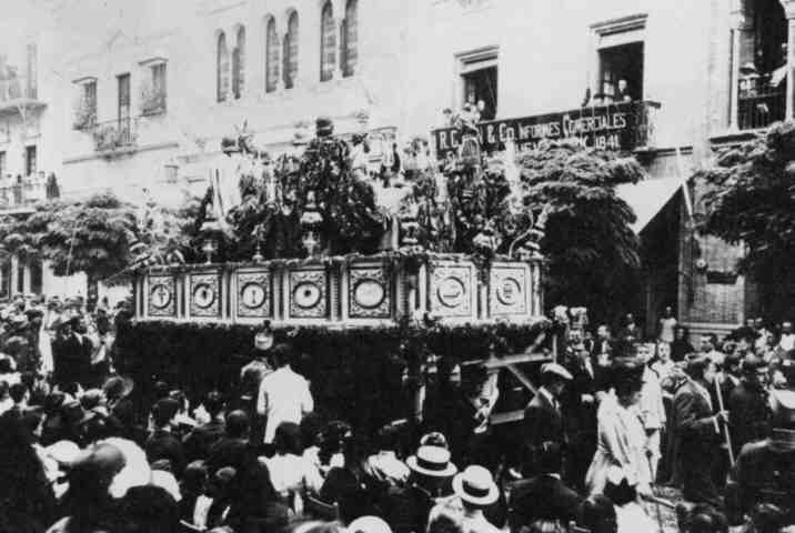 JULIO DOMINGUEZ ARJONA : No es la primera vez que ocurre, ya que ya lo hizo a mediados del siglo XIX y en el pasado siglo en los años 1919, 1991 y 1993. Por cierto, en esta ultima ocasión, coincidiendo con el Congreso Eucarístico y en vísperas de la segunda visita a Sevilla de su Santidad Juan Pablo II, la procesión amplió ligeramente su tradicional recorrido saliendo y entrando de la Catedral por la Puerta de San Miguel. También en ese año fue la primera vez que la Hermandad Sacramental de El Salvador procesionó su magnífica custodia sobre el paso de plata del Señor de Pasión. Traemos hoy una fotografía de la procesión del Corpus de 1919 a su paso por la Avenida en la que podemos apreciar el misterio completo de la Cena presidido por la anterior imagen del Señor de Manuel Gutiérrez Cano realizada en 1860. Destaquemos que en esta ocasión el Misterio participaba en la procesión del Corpus como un paso más, no como ocurrió en las dos ocasiones siguientes en que fue trasladado al altar de la puerta de la calle Alemanes del palacio Arzobispal, lugar ocupado habitualmente por el Señor de la Cena, solo, en las andas de la Humildad y Paciencia. Analicemos el paso y su entorno. Las andas, de madera pintada de blanco con escudos de órdenes militares, se habían estrenado en 1913 y tuvieron mala aceptación siendo sustituidas en 1921 por las actuales adquiridas a la Hermandad de la Carretería. Por su parte, el paso blanco fue vendido al Dulce Nombre que lo reformó cambiando los escudos pintados por cartelas y oscureciendo primero el tono de las andas que al año siguiente fueron doradas. En cuanto a las imágenes el Señor era la efigie que labró Gutiérrez Cano. Digamos como dato curioso que en los años sesenta fue adaptado como discípulo en una de las múltiples reformas del apostolado y que su busto puede admirarse actualmente en una vitrina en la sacristía de Los Terceros. Los apóstoles que vemos en la fotografía se estrenaron al tiempo que el paso (1913), eran de un taller zaragozano y de escaso mérito. No hay duda de que nos encontramos en la salida extraordinaria por el Corpus porque no vemos nazarenos y el paso camina en sentido inverso al habitual en Semana Santa. La fotografía está