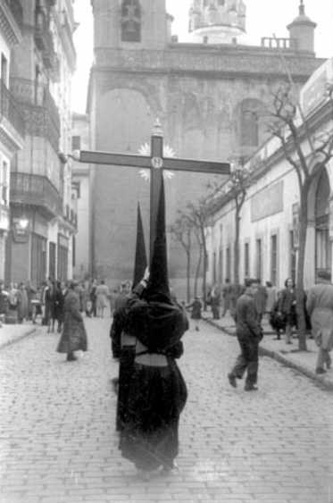 Le dare dos pistas claves de algo que continua de esta imagen , la Iglesia del fondo es la parte trasera de la Iglesia de la Anunciacion, de donde sale el Valle y el Amor ( y lo que les queda ) . Fijese en el espectacular cierro, que hace esquina de la calle que sale por la izquierda de la imagen .- ¿No se situan ?, ¿No identifica el enorme edificio de la derecha de la foto ?. Esta foto es mas antigua que la anterior pues es de fechas anteriores a 1948, a la derecha de los nazarenos esta la fachada del demolido Mercado de la Encarnacion , cuya fachada sur que es la que aqui ven llegaba hasta la boca de la calle Puente y Pellon , cuya balconada vemos en la imagen .- Es decir la Plaza de la Encarnacion no exisitia y los nazarenos de la foto superior una vez que cruzaban por la angosta calle Imagen, se daban de frente con el enorme edificio del mercado que tenian que circunvalarlo por la izquierda.- Si no se acaban de situar hoy a la derecha de esta imagen esta la depauperada Plaza de la Encarnacion con los jardines y la fuente publica mas antigua y mutilada de Sevilla En 1948 se derribó parcilamente el mercado , dando lugar en 1950 a una glorieta inmediamente pegada a la salida de Puente y Pellon, años depues con mas lógicas se abrio esta misma calzada situandola entre la anterior meritada calle y a la derecha la actual plaza ajardinada con la fuente que habia dentro del mercado . - Como ven no solo cambiaban los Sagrados Titulares, los pasos, las tunicas, sino la propia Sevilla, una especie de reina de Corazones , de Alicia en el Pais de la Maravilla que no para de moverse y de cambiar para estar siempre en el mismo sitio o como los afortunados versos de Becquer , tantas cosas que han cambiado sin saber porque // tantas cosas nuevas que han puesto sin saber como . Una geografia urbana escenario de nuestra Semana