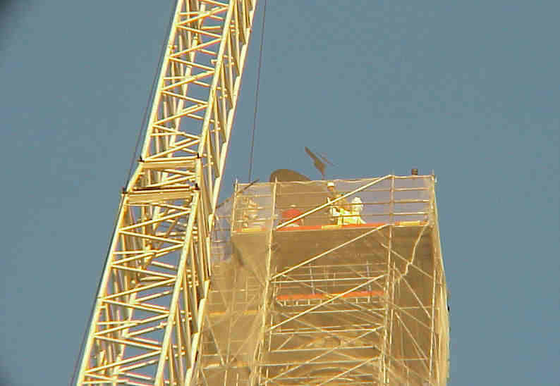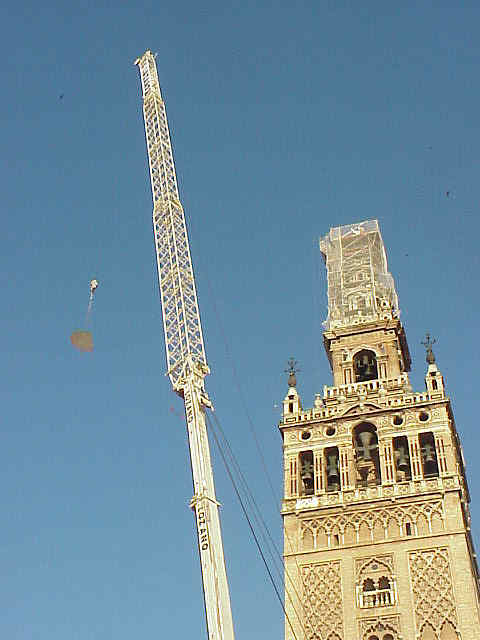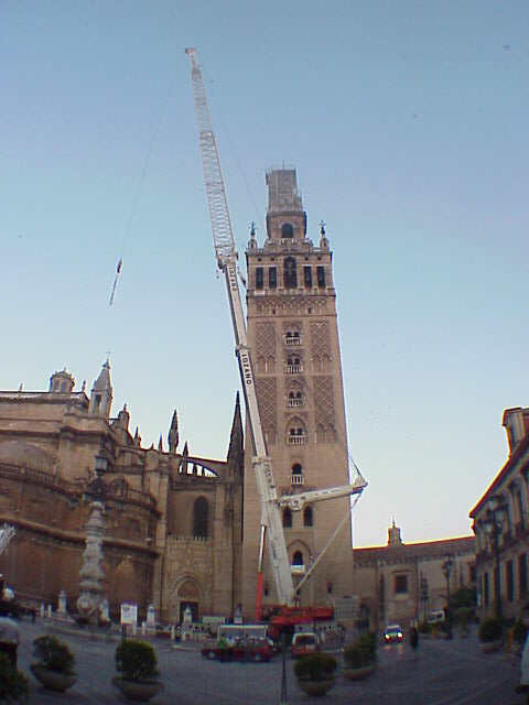 A las siete de la mañana , con este increible despliegue de medios mecanicos y humanos comenzaron las maniobras para desmontar la copia del Giraldillo, con esta obra de proporciones ciclopeas. Lo increible es que en 1568 cuando fue alli instalado el original , lo subieron ocho hombres, se sabe lo que comieron, se sabe lo que cobraron, pero sigue siendo un misterio como los subieron alli arriba , a base de lo que ustedes ya me entienden.-