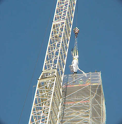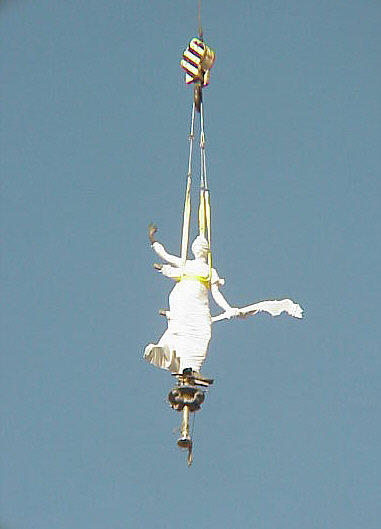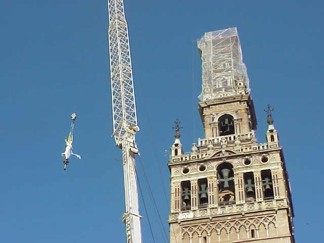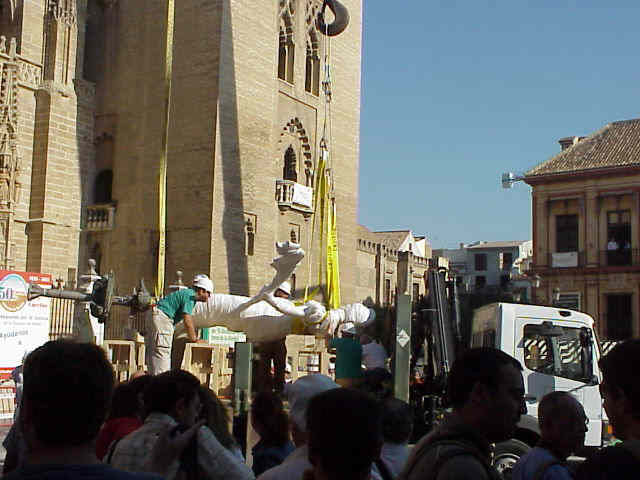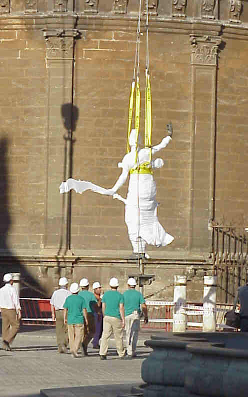 La copia del Giraldillo es izada de su anclaje y como ven queda suspendida en el aire para iniciar su descenso |
