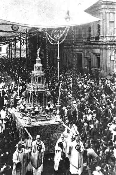 23 de Mayo de 2005 Llama poderosamente la atención a propios y a extraños que en una ciudad como Sevilla donde todas sus andas procesionales de penitencia, de gloria y sacramentales , son portadas por costaleros, menos la Custodia de Arfe del Corpus Crhisti de Sevilla que es llevada con ruedas .- Alguien, pudiera o pudiese, pensar que esto fue siempre asi y que se debe a su mas de cuatro metros de altura y su mas de 465 kilos de plata , ( VER ) hagan que el equilibrio o el desplazamiento del eje de gravedad haga inviable a los costaleros . Todo esto esta lejos de la realidad .- Fue precisamente en 1927 , cuando el cardenal Ilundáin prohibio los costaleros que hasta entonces portaban los pasos del cortejo, ya que en 1928 empezaron a salir con ruedas., luego la instantanea que aqui ven es anterior a dicha fecha.- Si se fijan en la foto , se ven la primera hileras de pies de costaleros portando la Custodia y delante de la misma, un señor vestido de negro de capataz, tambien la altura del paso es notable con respecto a la actual observerse la altura de la maniguetas por encima de la cabeza de los sacerdotes .- Con el paso de los años se volvieron a incorporar de costaleros a los pasos de San Leandro y la Inmaculada , a los que le siguieron los demas , pero curiosamente nunca se volvio a recuperar esta perdida tradiciòn, precisamente al paso mas fundamental, el del Santisimo .- Observen como la portada del Ayuntamiento no aparece