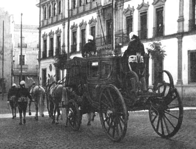 | JULIO DOMINGUEZ ARJONA 7 de Mayo de 2005 Traigo hoy una imagen que creo se puede datar también en los años cuarenta en que la la Carroza del Santísimo de la Sacramental de Pasión, atraviesa una desierta plaza de San Francisco (entonces de la Falange Española) en dirección a su Parroquia pasando por delante de la antigua Audiencia. La luz solar tendida y potente que entra por Entrecárceles y Chicarreros nos indica que está realizada a primeras horas de la mañana. No vemos delante rastro alguno de la procesión, en especial el palio de respeto para la Sagrada Forma que sería fácilmente visible, tampoco hay público, así que deduzco que se trata del traslado previo de la Carroza desde su garaje a la plaza del Salvador. Recordemos que esta Carroza de Respeto acompañada de seis servidores vestidos de librea a la federica figuraba al final de la procesión de impedidos, justo detrás de la banda de música, preparada para que se refugiase en ella el Santísimo en caso de lluvia. Esta curiosísima tradición dejo de realizarse a principios de los años setenta por los gastos que suponían el alquiler de los caballos y el mantenimiento del carruaje. Por cierto, obsérvese que mientras que en la fotografía del interior del garaje Laveran la carroza está tirada por dos robustos caballos en tronco, en la que presentamos hoy adivinamos otros dos caballos guía formando un enganche a la cuarta. Mas infromación : Un carruaje para el Santísimo