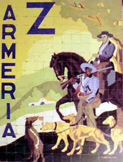 Como aun se puede seguir contemplado hoy en una calle Sierpes ( como ocurre en Tetuan ) invadida por un comercio globalizado de marcas internacionales, que encuentra usted en cualquier zona comercial de cualquier calle comercial de culaquier capital española ; vemos como el corazón del señor Zulategui , estaba dividido en dos, por un lado el recuerdo a su tierra con estos pelotaris jugando con palas al frotón en algun pueblo navarro con el mitico lema de Deportes Z y en el otro unos cazadores de a caballo, vestidos de corto, con sus galgos sujetos con traillas , las escopetas y cananas teniendo al fondo un cortijo , con el lema Armeria Z . ¿ Cuantos jugadores del Betis y del Sevilla durante casi un siglo habran . o les habran comprado , alli sus botas de futbol ?