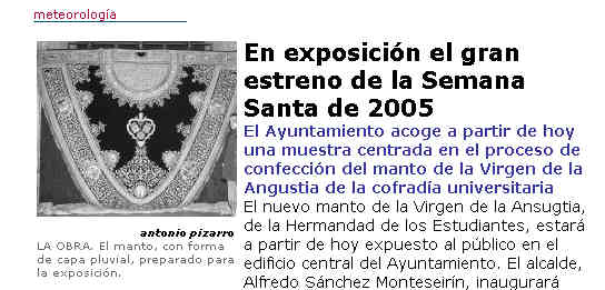 http://www.diariodesevilla.com/diariodesevilla/articulo.asp?idart=844865&idcat=1421 En esta noticia aparecida en el Diario de Sevilla de hoy vemos "Meteorologia" y hace referencia a la exposicion del nuevo manto de la Hermandad de los Estudiantes . A pie de foto , "El manto, con forma de capa pluvial". Suponemos que al que corresponda que maqueta esto, habra pensado que eso de pluvial, es sinonimo de lluvia y habra dicho tate " esto va del tiempo y de meteorologia ".- Miarma , rectificar esto y no menteis ruina de que vienen claros por Tomares
