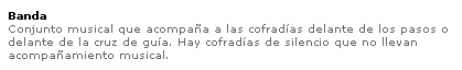 SIMPATICO DICCIONARIO COFRADIERO Muchas veces les he comentado , que en esto del mundo cofradiero , el pesonal esta ya de por si muy desorientado, para desorientarlo mas; por eso despues pasan las cosas que pasas y las que van a pasar. Si tiene usted a bien entrar en la web Guia Semana Santa , de la Caja San Fernando de Sevilla ( repito de la Caja San FERNANDO DE SEVILLA ) , tiene un gloriario que no tiene desperdicio : Ya saben a partir de ahora las bandas de musicas las pondran DELANTE de los pasos , suponemos que delante de los ciriales ! Magnifica definicion ! , por eso precisamente