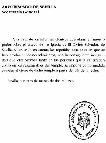 No habiendo recibido los Santos Sacrametos, sino la fria nota que aqui ven D.E.P Los sevillanos que no te olvidan , que nos criamos jugando en su rampa un Domingo de Ramos, los que se nos llenaban las retinas con todo lo que alli habia dentro, donde el contenido llenaba y superaba al inmeso continente; los que a las naves de su templo las llamabamos por nombre Amor y Pasion; los que en su plaza nos admirabamos de como en un solo dia Jesus salia en una Borriquita y volvia muerto delcolgado en una Cruz; los que viviamos una mañana de Jueves Santos, hoy huerfana y mutilada; los que entrabamos por aquel Patio de Naranjo con nuestras novias y mujeres vestidas de mantilla , los que nos bautizamos alli, los que nos casamos alli, los que despedimos a nuestros muertos alli , los que saliamos hacia el Rocio desde alli. Los que ingenuamente nos creiamos que aquello iba ser una restauracion y no una excavación .Los que nos creimos lo de la medida cuatelar NO ROGAMOS UNA ORACION POR SU ALMA Porque somos conscientes de que aquello JAMAS volverá a ser lo que era . Se han arrasado sin piedad, recuerdos, tradiciones, de generaciones completas de sevillanos convirtiendolo , en un absurdo museo arqueológico carente de valor historico, visitable por grupos con ridiculos casquitos , sin olvidarnos del invento de un patio de naranjo cubierto ( como si fuera un polideportivo de pueblo ) .- Esa es la muerte del Salvador, el haberle arrancado su alma, que no era otra que la suma de todo lo que habia alli dentro material e inmaterial, de cuantas oraciones, cuantas lagrimas, cuantas promesas, cuantos pies y manos se han besado, cuantas cera se ha quemado, cuantas gracias se han dado, cuantas flores se han marchitado alli, bajo la mirada del Señor de Pasion, de la Virgen del Rocio, de la Virgen de las Aguas o del Cristo del Amor , hoy todos ellos en una diaspora , una maldita diaspora ; pues al separarlos a todos, es como si se hubiera descuartizado nuestros sentimientos y recuerdos .- Hoy por todo esto no habra ningun funeral, ni por las miles de alma que fueron esterilmente violentadas de su descanso eterno ( aqui en Sevilla ni a los muertos los dejan tranquilos ) , no hay ni un triste recuerdo entre los prensa moradas , para este trozo tan importante de nuestra Semana Santa de nuestra Sevilla , que nos han arrebatado para siempre .- Sevilla no se merece esto , ni se merece que estemos en manos de los que ocasionan cosas como estas y encima te lo vendan como exito. Hoy somos muchos mas pobres que hace dos años, hoy no tenemos lo que teniamos hace dos años, hoy nuestra ciudad y nuestra Semana Mayor, son menos valiosas que lo eran hace dos años .-