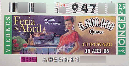 10 de Abril de 2005 Como ocurriera u ocurriese casi hace un año concretamente el 13 de mayo de 2004 donde vimos a SEVILLA EN EL CUPON DE LA ONCE , esta semana de cupÓn hemos pasado al cuponazo, pues para el próximo 15 de Abril ( bonita fecha) se lo han dedicado a la Feria de Abril.- Como pueden ver en el cupón aparece un estampa de una sevilla y Feria de Abril idílica, la Giralda la Torre del Oro,la maceta de gitanilla y una flamenca que recuerda mas a una hija de la Habana , que a una hija de la Tierra de Maria Santisima .- Quizás el diseñador de este cupón se deberia de haber esmerado mas y poner a la Torre del Oro en obras, dibujar una Feria de Sevilla con sus 370.000 bombillas apagadas a los tres de la mañana, pues por aqui hay paradogicamente mucho iluminado , que quiere imponer por cojones una serie de costumbres y tradiciones a algo que supuestamente es popular .- Tambien podria haber dibujada la hortera portada , que para nuestra vergüenza aparecera a partir de la semana próxima , en todos los medios de comunicacion y deberian de colgar en ella un cartel donde reze :"Reservado el derecho de admision" y donde se viera un carruaje detenido por la autoridad y con toda una sofisticada red de ordenadores a lo C.S.I Los Remedios detectando que su propietario es un peligroso falsificador de matriculas , pues no viene con un carruaje atribuido a Juan de Mesa .- Tambien podria haber pintado unas colas modelo Roma , para intentar coger un autobus que nunca vendra, ante la amenaza de huelga de Tussam , que como es lógico se reserva para la fiesta mas universal de Sevilla, para dar el cante no precisamente por sevillanas, de sus reivindicaciones laborales.- En lugar de esa amulatada y caribeña flamenca, deberia de haber pintado una cani hembra vestida de flamenca ( son inconfundibles ), sustituyendo los pendientes por piercing ( orejas, boca, nariz , ombligo y otras innombrables parte de cuerpo no visibles , salvo cuando van al servicio ) , acompañada por un cani macho, con gorrita blanca, los deportes de marca ( supuestamente robados a un joven pija que tenga su mismo numero ) , cadenas llena de llaves, y movil de ultima generación ( por supuesto , supuestamente robado al mismo joven de antes ) al cuello.- En cualquier caso, como en Las Guerras de las