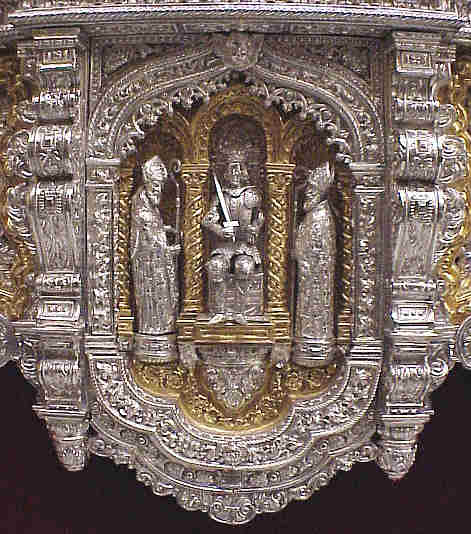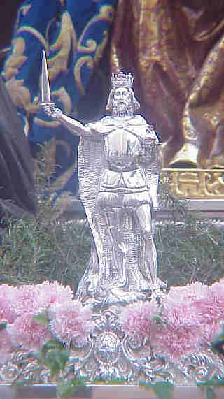 San Fernando esta en horas bajas, San Fernando es tan sevillano que como tal es malquerido por sus gobernantes y sus indolentes y adocenados paisanos, que no lo reivindican: Si San Fernando ayer al descubrir la urna de Laureano de Pina hubiera levantado la cabeza a buen seguro se habria puesto colorado aunque este momificado el pobre , como la mojama .- Sirva este modesto homenaje de las representaciones fernandinas argentas que hay tanto en nuestras hermandades de penitencia, glorias y rocieras .- En la solitaria imagen superior vemos el mas impresionante escudo de Sevilla , que sin duda hay en nuestra ciudad y que corresponde a esa plaza de España de plata ( copiray maestro Burgos) que es el paso del Señor de Pasion obra cumbre de la orfebreria cofradiera realizado por Cayetano Gonzalez .- En las dos fotos siguientes tenemos dos miniaturas de San Fernando el de la izquierda segun se mira en la delantera del paso de la Virgen de Valvanera con sede en la parroquia de San Benito, que como recordaran ( o desconocera ) existe la creencia que fue el primer lugar donde San Fernando celebró misa en la reconquistada Sevilla a los infieles, para que despues te quiten el dia de fiesta .- A la derecha segun se mira, vemos otra miniatura