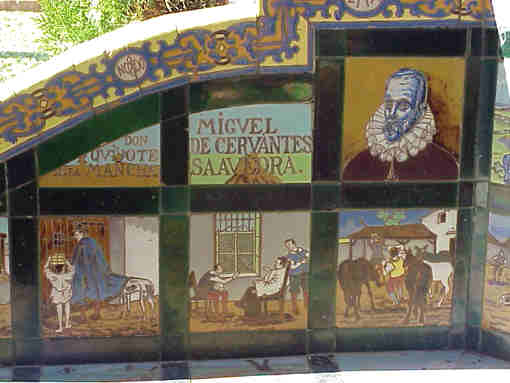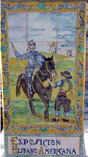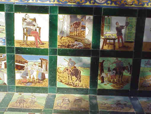 10 de Enero de 2005 Continuando con nuestro recorrido "cerámico quijotesco cervantino" ( ! toma ya ! ) ;nuestros pasos nos llevan hasta la Glorieta de Cervantes, sita en plena Plaza de America, exactamente situada entre el Pabellón Real y el Museo Arqueológico.- En serio les digo ,que es digno de la mas detenida observación pues en cuatro bancos a modo de viñetas de comics ceramico esta relatado el Quijote secuencialmente en imagenes., digno de un story book cinematográfico A poco que se tenga un mínimo conocimiento de la obra cervantina , usted podra "leer" la andanza de don Alonso Quijano, si una sola linea; algo muy adecuado para la actual cultura de nuestros niños de la LOCE, todo a base de dibujitos - ¿Ha nadie se le ha ocurrido hacer una PlayStation de Don Quijote , ahora que esta de moda eso de acercar el Quijote a los jovenes ? .Leerselo ,no se lo van a leer, eso esta claro .- Esta glorieta esta fechada en 1913 y como ya zagasmente