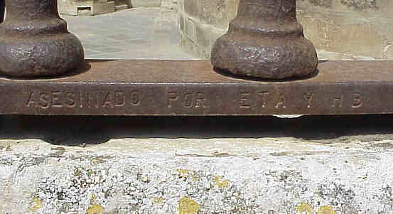 1 de Junio de 2005 Segun informa hoy el diario gratuito 20 Minutos VER NOTICIA ( las fuentes siempre hay que mencionarlas ) un joven casualmente ha descubierto esta inscripción en una de las rejas exteriores que rodean , la Capilla Real , en la Puerta de Campanillas ( que no tiene nada que ver con la amiga de Peter Pan ) "en memoria a Miguel Ángel Blanco Garrido asesinado por ETA y HB, por esos mamones, el 12-7-97" Las rejas fueron restauradas en la época , que ocurrio este tragico suceso , por la Escuela Taller Catedral de Sevilla y y alguien quizo dejar plasmado lo sucedido y lo que pensaba de ello .Olé lo que tenga en la entrepierna .- Curiosamente si uno recorre estas misma reja y la puerta siguiente , aparece practicamente un listado horizontal de nombres y apellidos de supongo personas que intervinieron en estas restauración .- Esto es como aquel que talló un astronauta en una de las puerta de la Catedral de Salamanca , conmemorando que el hombre llegó a la Luna .Segun dicho periodico los responsables de esta restauración han manifestado que piensa borrar esta incripción , por no autorizada, lo que seria un gravisimo error .- Hoy se habla de dialogar y/o/u negociar con "eta" ( siempre con minuscula ). Nuestra fragil y selectiva memoria historica olvida enormemente la cantidad de victimas de "eta", la cantidad de guardias civiles de pueblos andaluces que eran asesinados en la Vascongadas y eran enterrados de prisa y corriendo, pero no solo los mataba a ellos sino a sus esposas e incluso a sus hijos mientras ponian en peligro la independencia de las Vascongadas mientras dormian en sus casas-cuarteles.- Todos estos hombres, mujeres y niños, murieron sin manifestaciones en el norte , sin manos blancas, sin lutos , sin lazos negros . Pasaron años, ( he dicho años ) y un trágico dia los perros etarras nos pusieron a todos ,una pistola en la nunca, con un plazo fatal y en un bosque perdido de las Vascongadas al disparar cayó Don Miguel Angel Blanco Garrido; un vasco le pegaba un tiro a otro vasco y miren ustedes por donde esta sociedad vasca adormecida, esta sociedad silente, desperto y salio a la calle en sus propias provincias y ciudades vasca . Asi nacio el llamado espiritu de Ermua y el famoso grito del ! Basta Ya !. Algo habia cambiado en todo esto , tarde muy tarde, pero en algo habia cambiado y el coste habia sido terriblemente caro la vida de un hombre .- Quizas este homenaje grabado en hierro forjado , deberia de verlo nuestro querido ZP, deberia de recordar aquellas cienes y cienes de plazas de toda España , inundadas de oceanos humanos que guardaron infructuosamente aquella noche una vigilia de velas rogando por la salvacion de la vida de Miguel Angel, que esta banda de vulgares asesinos asalariados , lo ejecutaron fria y maquinalmente . - Quizas nuestro Gobierno en solo ocho años que lleva ahi esta inscripción desconocida por todos , sean para ellos unos mas que afortunado rabitos de pasas, para que lo que ocurrio despues, y que el impresionante movimiento social. que vino despues , sin precedentes en la historia de España sobre todo en las provincias españolas vascas, llena de españoles vascos, .- Enhorabuena a la persona que grabó esto, se quedo corto/a; enhorabuena al joven que lo ha descubierto ha sido como un mensajero del pasado y enhorabuena a 20 minutos por publicarlo en un momento clave de nuestra historia de relación con "eta" ,donde se estan escuchando tantas tonterias y sobre todo se esta olvidando a las vicitmas y a sus familiares de esta banda de criminales , pues solo son eso criminales Ya va siendo hora de llamar a las cosas por su nombre y faltaria reja en la Catedral de Sevilla para grabar todo lo que se pensó aquella noche y aquel tragico dia .- No lo borren , no nos traicionemos a nosotros mismos, ni a Miguel Angel Blanco, ni a Alberto , ni a Asen, ni a Muñoz Cariñano , ni a tantos hombres , mujeres y niños, ( por Dios tantos niños ) cuya sangre les salpicará y maldecirá eternamente a sus asesinos , a sus palmeros, a los que los justifican , a los que miran para otro lado y antes que Cielo confio que haya Infierno , donde lo pagen por siempre jamas .- Han escrito una verdad tan grande como donde esta escrita ,en la segunda Catedral mas grande del mundo.-