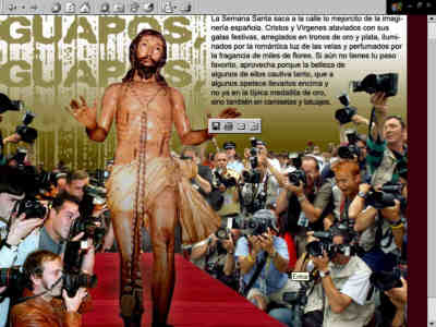 28 de Marzo de 2005 Palabrita del Niño Jesus de la Sacramental del Sagrario , que iba a colgar hoy en la web el cartel de "Cerrado por descanso y depre postcofradiera del personal" ( osea un servidor, es divertido me han llegado a preguntar estos dias que "cuantos eramos" en la "redaccion" de esta web ), pero claro uno tiene la mania de montarse en la barquita de la plaza de España ( que por cierto sigue mas seca que el ojo de Benito ) y se encuentra uno con cosas tan chirriante como estas . Un especial de el Diario El Mundo, bajo el acertadisimo titulo Guapos, Guaspos y Guapos .- Aclaracion importante en "esto" no tiene nada que ver Juan Miguel Vega, ni Francisco Robles que escribe en dicho diario y seria curioso ver si San Malaquias o el señor Robles hacen un ejercicio de auto-critica a este trabajito que no tiene desperdicio :