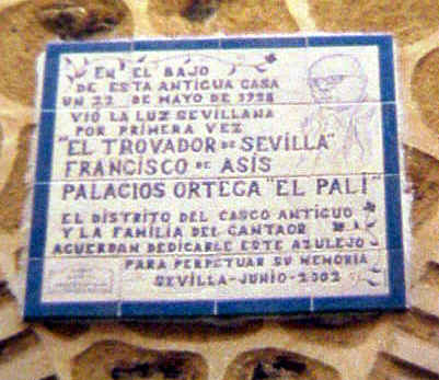 23 de Abril de 2005 En esta infraoctava de Feria; todos los santos tiene octava y les aseguro que lo del San Fernando bético de la portada de Feria, va a ir mas alla de una simple octava; puede tiene y debe que traer cola de "auténtica depuración de responsabilidades" ( tranquilos que no lo veremos ).- Hoy vamos a ser un recorrido quizas por uno de los cantautor de sevillanas mas emblemático de nuestra ciudad , donde cantaba a una Sevilla perdida que se nos fue o mejor dicho dejamo ir , que el maestro Burgos lo rebautizo como El trovador de Sevilla, de ahi que el propio cantante lo llamara , mi padrino . Como ya habran adivinado me estoy refiriendo a Paco Palacios "El Pali".- Como vemos en este primer azulejo Francisco de Asís Palacios Ortega, nace en calle Güines, nº 6-bajo, del barrio sevillano de La Casa de la Moneda, el día 22 de Mayo de 1928. Nombre artístico "El Pali", dicho apodo se debe, a que de joven era delgado como un "palillo".Paradogicamente con el paso de los años su cuerpo fue ganando en orondez (, parecida a la de un servidor) y sus caracteristicas gafas para paliar una aguda miopia, le dieron una imagen propia con mucha personalidad .- En sus sevillanas hizo la encomiable labor de