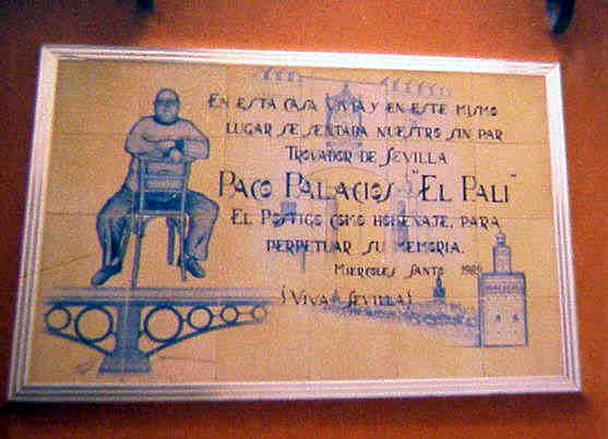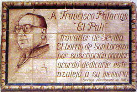 Azulejo homenaje en la Plaza de San Lorenzo num 6 , en reconocimiento a su vida artistica y dedicada a cantar a una Sevilla desaparecida :- ¿ Se imaginan que El Pali aun viviera? , Menos mal que murió , porque no nos imaginamos al difunto Paco Palacios sufriendo y cantandole a su Sevilla de su alma que lo esta perdiendo todo y .......que hoy no hay por donde cogerla .-