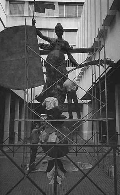 12 de Junio de 2005 Don Victor José Gonzalez Ramallo, nos hace una como siempre interesante retrospectiva de la copia del Giraldillo .- En esta semana se consumará el esperado descenso de la réplica del giraldillo desde lo alto de nuestra Tvrris Fortissima. Está réplica de la veleta original que coronaba la Giralda desde el 13 de agosto de 1568, fue realizada en 1981, al comprobarse en una restauración integral que se realizaba de la torre el lamentable estado en que se encontraba. Curiosamente entonces no se optó por la sustitución de la escultura original de Bartolomé Morel a la que ni siquiera se movió de su emplazamiento original para realizar la copia en poliester que pesó 300 Kg.- La réplica del giraldillo comenzó entonces una vida azarosa. Su presentación en sociedad tuvo lugar con ocasión de una exposición en la sala Villasís del Monte de Piedad, que había patrocinado la restauración de la veleta. El 21 de junio de 1981 la escultura comenzó a instalarse en el entonces descubierto pasaje entre las calles Martín Villa y Javier Lasso de la Vega tal y como apreciamos en la fotografía . La entidad financiera conserva en su poder una réplica, también a tamaño natural de la cabeza del giraldillo. Una vez finalizada la exposición la veleta pasó a la galería de la escalera del Palacio Arzobispal de donde se trasladó a Madrid para otra exposición en la Plaza del Rey junto al Ayuntamiento de la capital. Una vez devuelta a Sevilla fue desterrada a un rincón del primer patio del Palacio Arzobispal donde permaneció a la intemperie hasta que en 1986 se decidió exponerla permanentemente a los pies de la nave del Evangelio de la Catedral . Dentro de la Catedral permaneció también expuesta durante la Magna Hispalensis entre el 5 de mayo y el 30 de octubre de 1992. Cinco años después llegaría