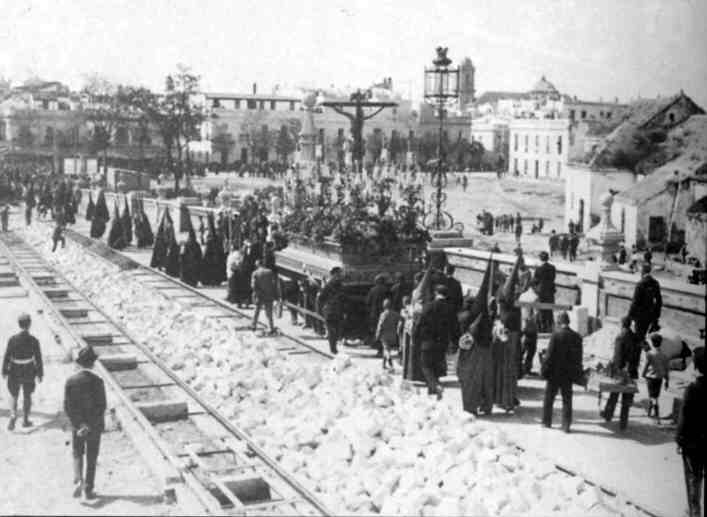 Hagamos un breve preambulo histórico, para que se me situen en el tiempo y sobre todo el espacio..Sevilla se veia atrapada por el Oeste por el rio y por el lado contrario por el Este por un naciente ferrocaril . En 1911 el genial Anibal Gonzalez diseña de una forma preclara una expasión de la ciudad hacia el Este, basando estas expasión en forma de abanico en tres "varillas" maestra las avenidas de Luis Montoto, Eduardo Dato y Ramon y Cajal , las cuales tenia que salvar el "rio ferreo" ( la ferrovia como la llaman los italianos ) ,para conectar el entonces centro de verdad , hoy Distrito Casco Antiguo, para lo cual se construyeron tres puentes "de secano".. Fruto de esa conexión aparecieron los barrios residenciales de Nervion y los obreros de Amate y El Cerro . De estos tres puentes con los cambios de la Expo 92 , solo queda de pie el que aqui ven el Puente de San Bernardo conocido popularmente por el Puente de los Bomberos, ya que bajo el se encuentra ,un parque de bomberos .- Aclaración importante el barrio de San Bernardo ya existia y sencillamente por el ferrocaril se habia quedado "aislado", y con serios problemas de vias de comunicación con el resto de la ciudad . Una fuertes y justificadas quejas vecinales en 1861 , motivaron las construcción de un tunel subterraneo que comunicaba la calle San Bernardo con la Avenida de Cadiz y que no se pueden ni imaginar en los tiempos de la Feria del Prado lo transitado que estaba y huelga decir a que olia permanetemente .- Tras estas puntualizaciones llegamos a la foto exactamente en 1924 , como ven en la imagen se esta construyendo el puente, observese los montones de adoquines preparados para su colocacion, las vias del tranvia estan "presentadas" , para quedar embutidas en el adoquinamiento de la calzada . El puente es una obra de tipo regionalista obra del arquitecto Juan Talavera y del siempre injustamente olvidado en esta obra del ingenirero Jose Luis de Casso y Romero . de corte tambien barroco esta inspirado en el Puente de Toledo de Madrid; mas desde su vista interior que desde el exterior; si algun sevillano ha cruzado por este puente madrileño tiene la extraña sensacion de que aquello le suena bastante . El 17 de diciembre de 1924, se inauguraba .- Si se fijan en la parte derecha del puente se ve un inmeso solar donde poquisimos años despues en 1927 se construiria el Mercado de la Puerta de la Carne , en la naciente calle Demetrio de los Rios, obra de los arquitectos Gabriel Lupiañez Gely y Aurelio Gomez Millan, el cual lleva años cerrado y en "supuesta rehabilitación", (aqui en Sevilla los edificios se "rehahilitan solos" , se caen a pedazos y mueren de pie ).,pues la no remodelación , del edificio en si , la justifica nuestro Ayuntamiento, porque los comerciantes estan mas a gusto donde se lo han llevado," provisionalmente" también, a la que fuera estación de San Bernardo. Esperemos que pongan allí en azulejos, como el de la Encarnación , "Mercado de la Puerta de la Carne, Instalaciones Provisionales, 1999", ya va para seis años .- Continuando con la foto, efectivamente la cofradia que vemos es San Bernardo . El paso fue el último año que salio de estilo neogótico obra de Jose de la Peña y Ojeda en 1881 y que seria sustituido en 1925 por otro obra de Jesus Gil. A los pies aun llevaba la Magdalena orante obra de José Ordoñez Rodirguez El Cristo lo pueden ver mas de cerca aqui -en una retronspectiva de 1928 y pueden ver como lo dejaron los rojos en la II Republica Española y en prolegomenos de la Guerra (In) Civil Los pedazos del Cristo de la Salud , fotos que con toda seguridad no veremos en los cursos estos de Recuperacion de la Memoria Historica .- ¿A nadie se le ha ocurrido hacer unos cursos o exposicion de La Semana Santa de Sevilla en la II Republica , cuando los rojos confundieton ,como el actor sir Anthony Hopkins, en Mission Imposible II , las iglesias y el patrimonio cofradieros en las Fallas de Valencia ? Una hermosa imagen de Sevilla en construccion y hoy tenemos una imagen de esta zona mas deprimente, Sevilla bajo el efecto del elemento mas destructivo, la decidia y abandono .-