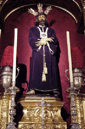 11 de Febrero de 2005 Hoy es primer viernes de Cuaresma, y si pasa por la Plaza de San Ildefonso y vea tanta gente en cola, no piense que todos se han vuelto locos con una ingente necesidad de comprar yemas en el vecino convento de San Leandro y del que hablara el añorante Cernuda en su Ocnos ideal, hoy es primer viernes de Cuaresma en Sevilla y toca ir a ver al Cautivo y sin que nadie se moleste, en Sevilla el Cautivo , es el de Sal Ildefonso .- Es un fenomeno curioso , que se repite cada viernes cuaresmal pues es la unica imagen pasional , que ni procesiona , ni tan siquira tiene cofradia y la devocion que los sevillnaos sienten por el, en particular en estas fechas , solo es comparable con el plenipotenciario Señor de Sevilla , es un fenomeno multitudinario compable a lo que sucede en Madrid con Medinacelli .- Es venerado en la Parroquia de San Ildefonso y recibe sus cultos anuales en Cuaresma, realizando desde hace pocos años , un Via Crucis ( Aclaracion: un Via Crucis no es una procesion , ni una salida extraordinaria es un ejercicio de oracion piadoso ) el Viernes de Dolores en unas andas propias. La canastilla, de estilo renacentista, está realizada en caoba con cuatro capillas para llevar las imágenes de San Ildefonso, Santiago Apóstol, la Virgen de los Reyes y la Inmaculada Concepción. Las capillas están flanqueadas por columnas que reproducen Lleva cuatro faroles de madera terminados en plata. El diseño y la orfebrería son de Manuel de los Ríos y la carpintería de los hermanos Caballero. El llamador es de Fernando Marmolejo La imagen de Ntro Padre Jesus Cautivo y Rescatado es una obra anónima del siglo XVIII , que recibe culto en la Iglesia de San Ildefonso y por la que los sevillanos sentimos una gran devoción , basta ver , como decia mas arriba las colas que se forma los viernes de Cuaresma . Hizo el Via Crucis a la Cruz del Campo en 1964 veintinueve años antes que fue el primer Cautivo el de Santo Genoveva al Via Crucis de la Catedral .- La Virgen de los Reyes participó con dos procesiones extraordinarias en la Santas Misiónes Generales de Sevilla. La primera el 14 de febrero y la segunda el 31 de marzo. En la primera ocasión acompañó a la Patrona el Señor Cautivo de San Ildefonso, que aqui ven , organizándose la concentración de fieles junto a la Catedral, en la zona frente al Archivo de Indias; y en la segunda se trasladó a la Puerta de Jerez, donde se celebró el multitudinario acto de clausura.- Tambien es conocido como el Cristo de Medinaceli al ser una réplica del original que se encuentra en los Capuchinos de Madrid y que es propiedad de los Duques de Medinaceli .- Esto es señal inequivoca de que la Cuaresma