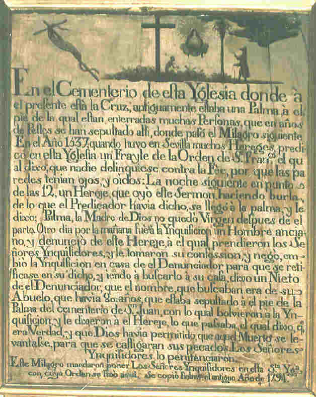 Este documento que ven aqui esta enmarcado en la Iglesia de San Juan de la Palma ( si no lo ven bien aumente la resolucion de pantalla a 800x600 ), donde se relata como un señor blasfemó , fue denunciado por un señor que llevaba 80 años muerto y sepultado ( de ahi obviamente el prodigio ) a la Santa ( que de santa tenia poco ) Inquisición .-
