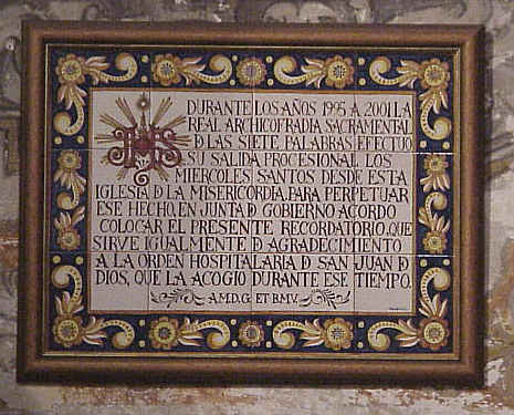 7 de Marzo de 2005 Es curioso porque en algunos medios de comunicacion y algunas paginas webcofradieras han aparecido comentario de que las relaciones entre Hermandad de Pasion y la Orden de San Juan de Dios , digamos no son muy fluidas y cuestionadose si la Iglesia de la Misericordia , es o no es, el sitio mas adecuado para que este alli el Señor de Pasion. Con independencia de este tema y a las referidas informaciones me remito , quizas muchos ignoren la tradicion cofradiera de esta Iglesia :- Entre 1842 y 1847 y entre 1868 y 1870, estuvo alli el Santo Entierro; estos ultimos años coincidiendo con la Amargura. Entre 1958 y 1964. La Cena y entre 1958 y 1960 El Rocio, donde como vemos coincidieron ambas hermandades cuatro años . la ultima en estar alli antes de Pasion, fue Las Siete palabras entre 1995 y el 2001 aunque solo para Semana Santa .- Dentro de la Iglesia para los que ande chungo de la vista se puede leer en este azulejo : "DURANTE LOS AÑOS 1995 A 2001 LA REAL ARCHICOFRADIA