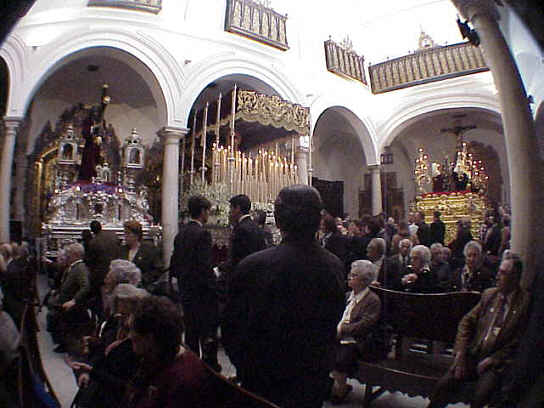 Esta foto "historica" de un 31 de Marzo de 1999 , de un Miercoles Santo por la mañana en el meritado templo, que como hemos visto historicamente no son nuevos en esta plaza acogiendo hermandades que buscan refugio y asilo, como le ocurre desgraciadamente en la Hermandad de Pasion, que en su casa han montado un Museo Arqueologico Cubierto con casquitos de obras y cobrando entradas y que los unicos muertos que no han sido molestado en su descanso eterno ,son los que tienen en su cripta .- Quizas el camino no sea pbsecarse en el quimerico