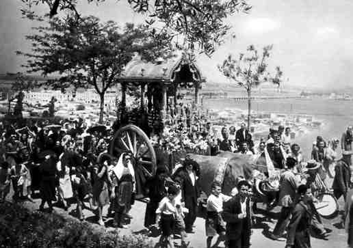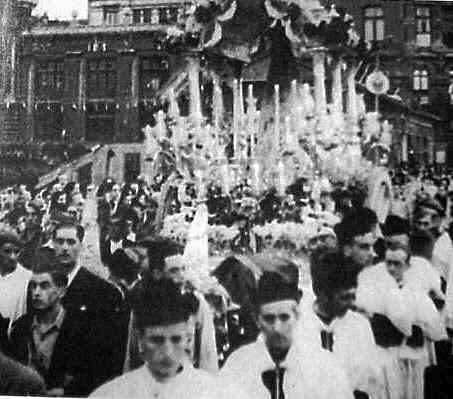 Aqui volvemos a ver la carreta del Triana de los Montpensier, pero en Bilbao, portando a la Virgen de Aranzazu, rodeada de sacerdotes y seminaristas en el año 1939 para conmemorar el final de la Guerra Civil