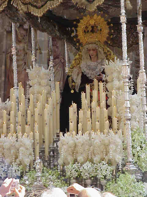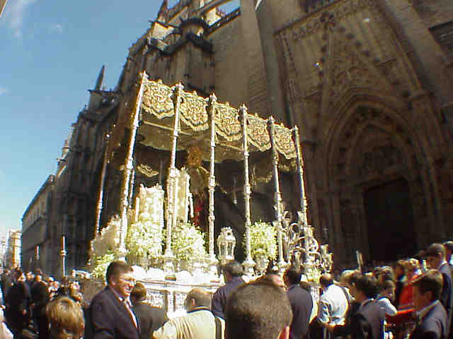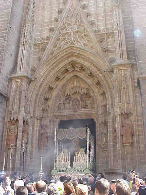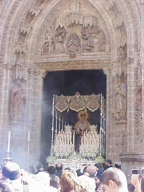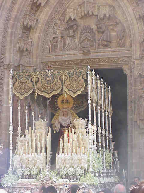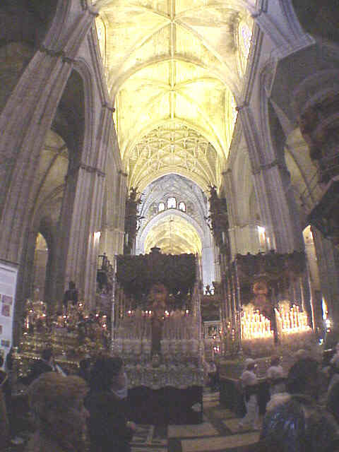 Las fotos "historicas" que genera de la lluvia en el trascoro de la Catedral los Sagrados Titulares de San Genoveva con la Virgen del Rocio de la hermandad del mismo nombre , que buscaron refugio en el templo catedralicio por mor de las inclemencias del tiempo .- |