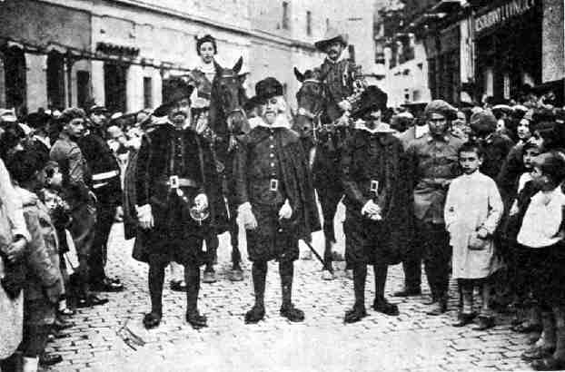 Continuando con imágenes de la Cabalgata Histórico-Mariana de la tarde del 20 de mayo de 1929, vemos hoy fotografías de los tres últimos cuadros. El cuadro superior estaba dedicado al segundo viaje de Colón al Nuevo Mundo (1493) en que el Almirante acompañado de su hermano Bartolomé, sus hijos Hernando y Diego junto con frailes, marinos y los caballeros veinticuatro se dirige a implorar el auxilio de la Virgen de la Antigua para iniciar la Evangelización. No se pierdan el segundo figurante a la derecha de la imagen , con unas inadecuadas gafas de sol Este cuadro fue organizado por las Condesas de Ibarra y Bustillo en nombre de la Congregación de las Irlandesas. La fotografía está tomada unos metros por delante de la de San Fernando, pues se aprecia la esquina del palacio de Palomares, entonces Almacenes del Duque Entre el cuartel de Artillería del que vemos la puerta con visera y este palacio sobre el que se edificaría El Corte Inglés existía una tortuosa vía conocida como Callejón de Los Estudiantes que comunicaba con la calle Alfonso XII y del que adivinamos su entrada.