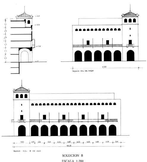 Pronto se cumplirán cuarenta años de uno de los mayores destrucciones del patrimonio histórico-artístico sevillano, perpetrado en los, al respecto, nefastos años sesenta. La demolición de tres casas-palacio en la plaza del Duque para la construcción del primer centro comercial de El Corte Inglés en Sevilla. Hecho todavía más inconcebible si pensamos que al iniciarse los trámites se encontraba al frente del consistorio un catedrático de Historia del Arte de gran prestigio, el trianero José Hernández Díaz. Las casas desparecidas fueron la que albergaba el Colegio “Alfonso X el Sabio” y los palacios de Miguel Sánchez-Dalp y del Marqués de Palomares, sede este último durante muchos años de los “Almacenes del Duque”. Previamente habían caído por la piqueta el teatro del Duque (1950) que se alzaba donde hoy se encuentra el edificio de sindicatos (hoy de CCOO) y el palacio de los Cavaleri (1963) del que sólo persiste la portada integrada en el edificio del anexo de “El Corte Inglés”. Pensemos que en esa época no existían todavía otros edificios de parecidas características como el que albergaría a diversos grandes almacenes en la cabecera de la plaza (Simago, Mark&Spencer, etc) o el de Seguros Ocaso en la esquina con Campana y San Eloy. Quizás lo que pocos conocen es que, consumada la compra de los solares por la empresa presidida por Ramón Areces, se propusieron alternativas a la fría fachada sin ningún elemento local con la que finalmente se dotó al nuevo edificio. La propia empresa constructora, con más voluntad que acierto propuso otras fachadas con tópicos aditamentos presuntamente sevillanos. Como ilustración de estas propuestas aportamos las dos primeros bocetos en los que sobre un esquema similar al elegido se adicionaban yeserías neomudéjares. Este pastiche creemos que con buen criterio fue descartado por el ayuntamiento. Otras propuestas de fachadas, más interesantes, fueron las realizadas por el propio Hernández Díaz con el asesoramiento de arquitectos amigos y que fueron también descartadas, en este caso por su sucesor en el cargo de alcalde, Félix Moreno de la Cova. El elemento singular de este proyecto era un torreón de esquina que pretendía evocar el que poseía la casa-palacio del marqués de Palomares del siglo XIX. También aportaban valor local los soportales con arcos de medio punto y una terraza corrida con balaustrada de hierro, solución utilizada años más tarde en el edificio de la Facultad de Bellas Artes de la calle Laraña.