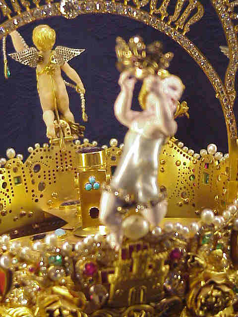 Fue tal el acierto de conjugar perlas , oro y piedras preciosas, que si se fijan en el angel que sostiene la corona , el tronco del cuerpo y parte de las piernas son el capricho de la Naturaleza de una perla natural de notables proporciones y curiosa forma, que el joyero sin duda supo aprovechar , para completar el cuerpo del angelito que aqui ven .-