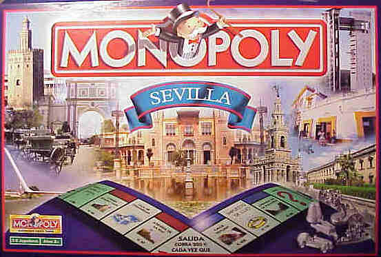 27 de Noviembre de 2005 Por si aún no se han enterado el popular juego MONOPOLY ( en mi época se llamaba este o un juego similiar El Palé o El Juego de la Paz ), donde uno pasaba por calles de Madrid construia casitas y hoteles , de esa manera el que pasaba por alli , tenia que pagar dinero "de pega", a los jugadores contrarios .- Pues bien , si antes las calles de este conocido juego de mesa de camilla ,en tardes de otoño e invierno con copa de cisco y alucema ; estaban sacadas del callejero madrileño : Serrano, Velazquez, Goya, Gran Via, Leganitos, Bravo Murillo ; Paseo de Recoletos, Alcala etc; en esta nueva versión encontraran un curioso recorrido por el callejero sevillano , incluyendose en cada casilla una foto de la misma .- Uno se pone en la casilla de salida ,( los que conocen el juego ya saben que van de calles cuyo valor del suelo y de paso va de mas barato a mas caro ) y van directos a la Avenida de la Paz ( Poligono Sur ), la siguiente en la Avenida Ramon y Cajal ; el siguiente grupo esta formado por la calle Salado, Avenida de Kansas City ( con el monumento al indio ) y la Ronda de Capuchino .- En el siguiente lateral del tablero tenemos la calle Torneo, Calle Castilla ( para los capillitas la foto pertenece a la Parroquia de la O ), y Avenida de Luis Montoto ( con los Caños de Carmona ) .Seguimos con Avenida de Felipe II ( con una imagen al fondo del Pabellon Real ), Paseo Colon ( con la Torre del Oro ) y Pages del Corro.- El siguiente lado del cuadrado de juego esta formado por el grupo de calle Betis, Plaza de Santa Cruz ( con la Cruz de la Cerrajeria ) y Avenida de Reina Mercedes, ( curiosamente con el resto de la torre del Pabellon de Cordoba dela Exposición del 29 ) ; el siguiente comienza con la Plaza de Don Juan de Austria, que el 99% de los sevillanos no tiene ni pajolera idea de donde esta, pues es conocida por La Pasarela,( con la Fuentes de las Cuatro Estaciones , ademas es curioso porque precisamente en esta Plaza no vive nadie ), Avenida de Reyes Catolicos y Avenida de Eduardo Dato ( con una foto del puente de San Bernardo ).- Terminamos el recorrido con la Avenida de la Buhaira ( con una foto del Palacio y amberca ), la Plaza de Cuba y calle Sierpes ; terminando con la Avenida de la Palmera ( lo siento pero no se ve ni er campo er Betí, ni acolasa la Copa ) y la calle Tetuan . Todas ellas como las zonas mas caras de nuestra ciudad ; esta ultimas deberia de haber rotulado sus cartones directamente con la palabra "hipoteca de por vida" .- Señores de O´Donnell yo lo siento bastante pero de ustedes no dice nada ni peatonalizados , ni sin peatonalizar . Curioso de los Remedios ni mu de Asuncion, ni Republica Argentina ( pensaria que la estaban construyendo ), ha elegido Salado .- Los que han adaptado este juego a Sevilla en las tarjetas de "Suerte" y "Caja de Comunidad", podrian haberlo adaptado a la realidad y haber puesto cosas como : -"Ve a la calle Pastor y Landero a pagar los Impuestos Municipales llevate dos turno sin jugar por guardar cola ".- -"Retrocede a la casilla de salida al encontrate una manifestación de taxistas en la Plaza Nueva y no porder seguir avanzando".- -"Un grupo de canis y kies te han robado la cartera a la salida de una discoteca abona a la caja 200 euros ".- -"La movida se traslada de tu calles donde tienes tus casas y se ubica en las de un jugador contrario por lo que disminuye el valor de sus terrenos" .- - "Ha caido en la casilla empresa suministradora de electricidad con esta tarjeta se libraras de un apagón en verano " .- - "Pierde tu hotel por ruina del negocio al abrir en tu calle una nueva linea y obra de metro, con una tuneladora pierde tanto aceite que busca pareja para boda gay " .- -"Por tu calle no paga ningun jugador, durante veinte turno , porque han levantado una calicata para meter un cable que se les habia olvidado".- - "Por un turno no puede pasar nadie por tu calle porque hay una salida extraordinaria de una cofradia al cumplirse el cincuenta aniversario del martillazo que se pegó en el dedo el prioste segundo" .- - "Con la tarjeta de "no hay suficiente efectivos de policias" te libras de ir a la casilla de la carcel , aunque te aguantas con los veladores que han puesto debajo de tu casa " ......y asi podriamos rellenar unos cuantos de folios .- El juego esta decorado como ven en la foto por un collage de fotografias de monumentos sevillanos y en su interior hay otro diferentes con imagenes de la Plaza del Triunfo , la Feria, el Alcazar y la Macarena ( solo de la universal Macarena , no busquen mas porque no hay ) . En las cantoneras de la casa diferentes monumentos y lugares sevillanos con el tremendo lapsus de incluir la Ruinas de Itálica, que señores mios , pertenecen a la vecina localidad de Santiponce PROVINCIA de Sevilla, , puesto a incluir ruinas podrian haber puesto una foto de la ruina del mal llamado Estado Olimpico, que la mitad esta en el termino de Sevilla Capital .- Asi que ya saben , ya tiene una idea para los