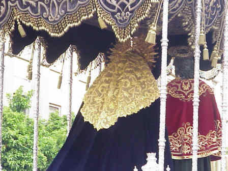 San Juan Evangelista de Jesus DespojadoLos tres únicos titulares que acompañan a la Virgen bajo palio son el San Juan de la Hdad de la Amargura . la Bofeta y el San Juan de la Hdad de Jesus Despojado este presente la peculiaridad , de que va en el lado contrario que todos los demas, Todas los San Juan segun se mira el paso de frente, van a la derecha y este es el único que va a la izquierda de la Virgen , el motivo es que durante muchos años se quizo recuperar la iconografia perdida de incluir en el palio a Santa Maria Magdalena .-