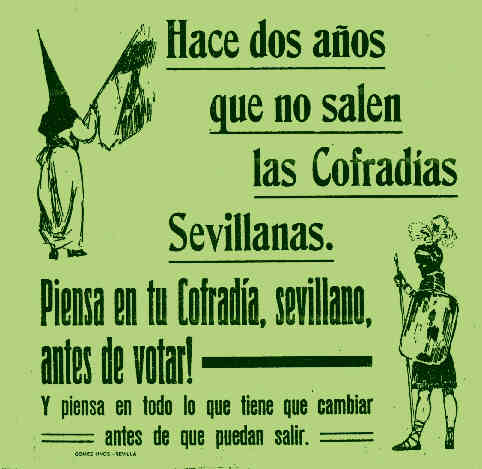 Ayer al pasar la Hiniesta abuelos y abuelas que peinan todo canas , le explicaban a sus adolescentes nietos que no sabian diferenciar gracias a la LOCE a Franco del Cid Campeador , esta octavilla de una Sevilla sin Cofradias, de Iglesias en llamas, de profanaciones de tumbas de monjas y frailes, para usarlo de tiro al blanco , de crucificciones de monaguillos en la iglesia d eun cercano pueblo a nuestra ciudad. En suma , con una democracia mas que consolidada, ayer una generación tuvo que explicar a su descencia como hubo un tiempo en que los españoles, los andaluces y los sevillanos se volvieron todos locos y se liaron a tiros unos contra otros y todo lo que amamos y adorado, era profanado y quemado por una turba ( si he dicho turba ) enloquecidad en una orgia de destrucción .-
