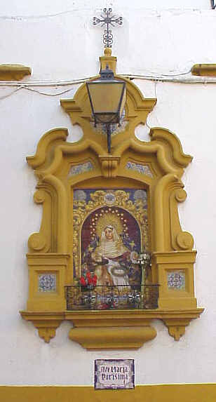 3 de Marzo de 2006Continuamos con este recorrido de "fotos antiguas cerámicas" y llegamos a una de las mas bella y a la vista está maltratadas. Es lamnetable es aspecto que ofrece este magnifico lienzo ceramico enmarcado , con esa horterada de farola en medio ( por lo visto no habia mas sitio donde ponerla ), asi como esas "lianas electricas" muy porpias del casco antiguo de Sevilla, por las que un Tarzán urbano podria ir saltando de calle en calle. Este maltratdo , en una capital centro europea , a esta obra digna de estra en un museo sería impensable .-