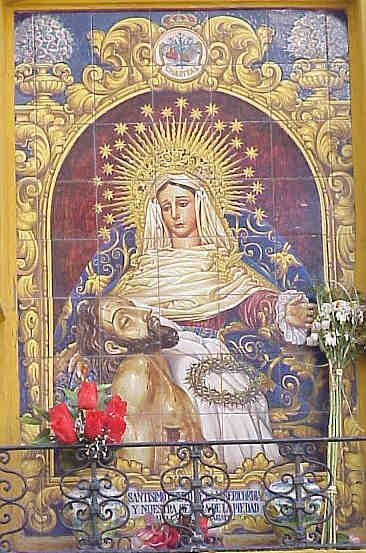Quizás algunos lectores , recordaran cuando recorrimos LAS PUERTAS DE SEVILLA , comentamos de pasada , esta mágnifica obra esta situado a una de las entradas del Arco del Postigo que representa a la Virgen de la Piedad y el Cristo de la Misericordia de la Hermandad del Baratillo .-