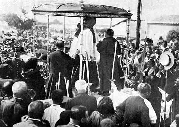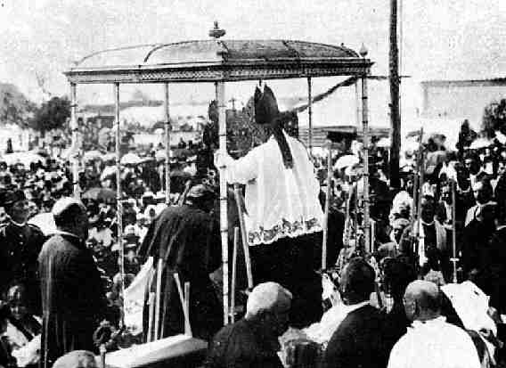 El principal impulsor de la coronación de la Virgen del Rocío fue el canónigo lectoral de la Catedral de Sevilla, don Juan Francisco Muñoz y Pabón que publicó en la primavera de 1918 un famoso artículo en "El Correo de Andalucía" que logró movilizar a muchos rocieros de toda condición. En nuestra fotografía de hoy vemos a este recordado y orondo sacerdote, ayudando a Su Eminencia Reverendísima el cardenal don Enrique Almaraz y Santos, arzobispo de Sevilla, en la imposición de la presea a la Reina de las Marismas. Tengamos en cuenta que hasta los años sesenta la provincia de Huelva pertenecía a la diócesis sevillana. Los dos prelados, de espaldas se encuentran subidos a las antiguas andas de la Virgen del Rocío, que contaban entonces con ocho varales, a diferencia de los seis que sujetan su baldaquino desde 1934. Como fondo de la toma, vemos la explanada delante de la ermita, repleta de fieles, portando muchos de ellos sombrillas para librarse del sol de esa luminosa mañana de junio. Se calculó que unos 25.000 rocieros se dieron cita en la ceremonia (compárese con las cifras más o menos infladas de la romería actual), que fue seguida de una procesión triunfal de regreso a la ermita. La celebración de