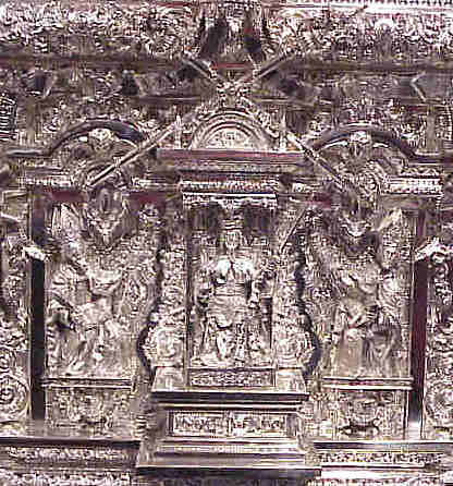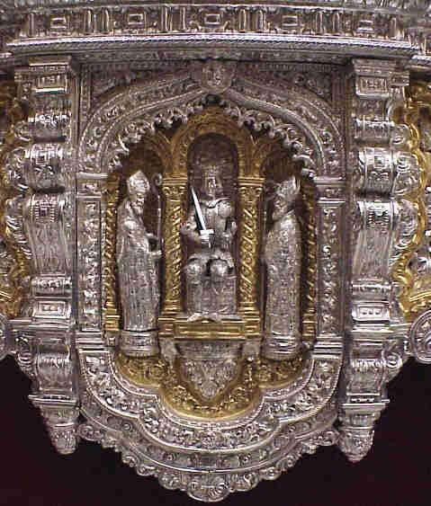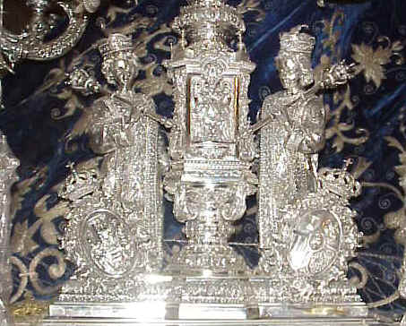 A continuación , tenemos unos bellos basamentos de plata de unos candelabros de cola donde esta representado a los "maceros" ( por aquello de la ciudad - versus ayuntameinto-) bajo mazas ), donde se puede ver el escudo de Sevilla a los pies de la figura de la izquierda segun se mira .-