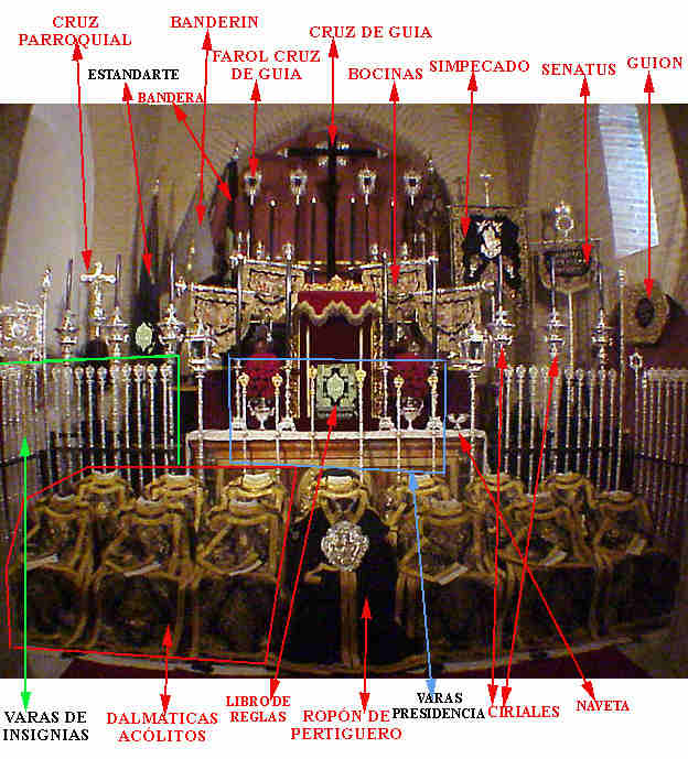 Ademas de los paso, encontrará los ALTARES DE INSIGNIAS , donde cada hermandad expone todos los elementos que por la tarde sacarán a la calle y serviran para ir separando como veiamos ayer los tramos de nazarenos . Algunas de estas insignias se repiten en todas las hermandades ( Cruz de Guia, Senatus, Simpecados, Libro de Regla, Estandarte, bocinas, varas etc ) y despues otro tipos de insignias a tenor de las peculiaridades o titulos de cada una de ellas ( Guiones Sacramentales, Banderas Pontificias . Banderas Concepcionistas, etc ).-