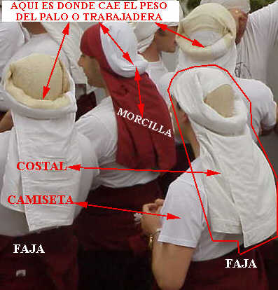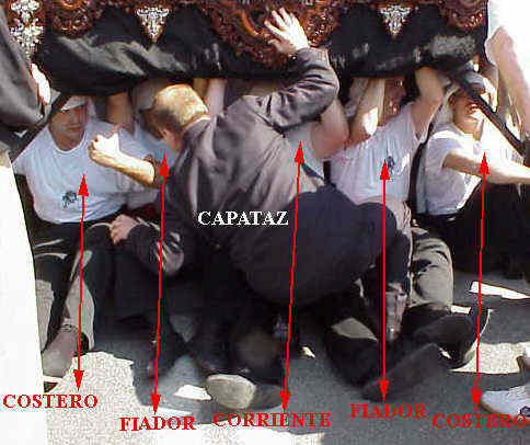 Como ven en esta foto de una parada van en linea de cinco en fondo por trabajadera o palo ( por lo general 8 en los pasos de Cristo y 6 en los pasos de palio ) . Según el lugar que ocupen en esta alineación reciben los nombres que ven en el esquema .-