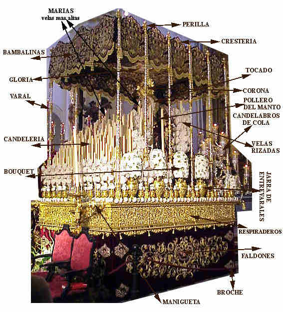 Todos los pasos tiene una estructura o armazon llamado parihuela , QUE NO SE VE . En su parte superior estan palos situados paralelamanete llamados trabajaderas es donde con el cuello portan los costaleros los pasos .-
