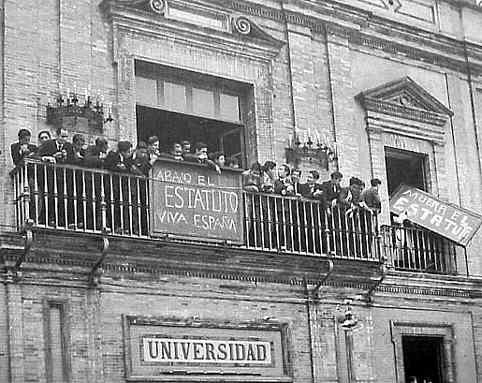 Esta foto es de Mayo de 1932 , pero podria ser de hace un par de meses. hay una revuelta universitaria en la antigua Universidad de Sevilla de la calle Laraña, en contra del Estatuto Catalán ( entonces no se llamaba estatut). ¿Les suena esto del Estatuto Catalan ?. Pero lo peor de lo que ocurrio en Cataluña estaba por venir . - El 6 de octubre de 1934 , dos años despues