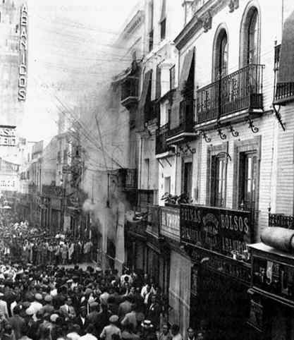 La respuesta marxista popular , no se hizo esperar y al dia siguiente del fracaso de la intenton golpista le pegaron fuego al Circulo Labradores, al Circulo Mercantil , como ven en la foto de la calle Sierpes entre otros . amen de las habituales manifestaciones, tumultos diversos atentados a templos y casas particulares .- Estaran conmigo que fue un año muy movidito y solo les estoy hablando de Sevilla .-