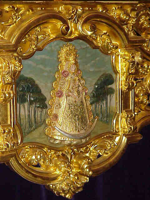 Como pueden ver ,en uno de los laterales de los referidos respiraderos se ve policromada una bella imagen de la Blanca Paloma, en medio de una gran vereda o camino de arena que se nos antoja la Raya Real y ambos lados una hilera de pinos ,( aunque no se ven las alambradas y los prohibidos el paso ) en una evocación indiscutiblemente rociera de esta hermandad tan trianera, que por cuyas puertas, dentro de unos dias pasaran .las hileras de carretas de la hermandad trianera camino de la ermita .-