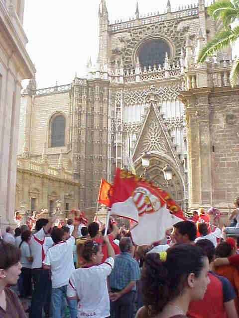 Sevilla , Catedral ,Puerta del Principe hora 19h 30 . Estas personas que aqui ven, se llevaron la broma de cinco horas esperando la llegada de la Copa de la UEFA, que llegó pasada la medianoche , donde mas que la Virgen de los Reyes; fue Ntra Sra del Transito, pues a estas horas La Pobre, estaria ya durmiendo y el Niño Dios sin sus zapatitos, ya en pijama .-