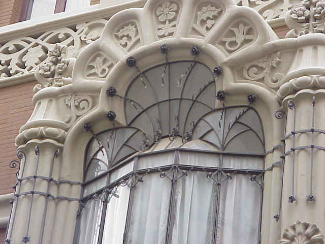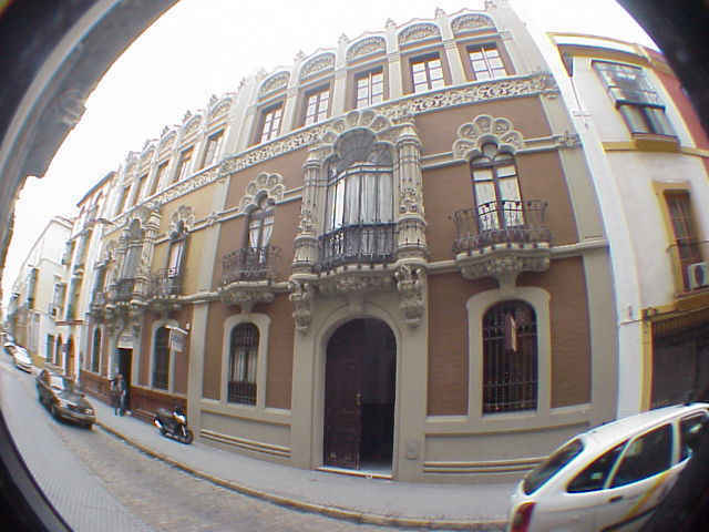 Observense los detalles de balcones , cierros (quizas unos de los mas sofisticados de Sevilla ) y la presencia en todos ellos de novedosas flores y hojarascas , tallados y en hierro forjado . ¿Cuantas veces habrá pasado por alli y no se ha detenido ?; posiblemente al no ser muy ancha , impiden ver este edificio de viviendas en toda su belleza en este feliz su primer centenario .-