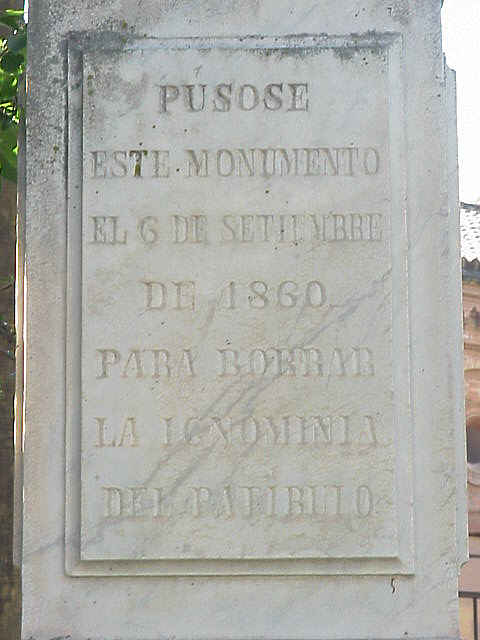 El problema es que sus verdugos para humillarlo lo ajusticiaron en plaza publica concreatemnte en la Plaza de San Francisco( mas pública imposible ) y en el cadalso, como un delicuente comun, cuando dada su condición de militar deberian de haberlo ejecutado ante un pelotón de fusilamiento . Como reza en la placa lo llevaron al cadalso el 9 de Marzo de 1832 .-