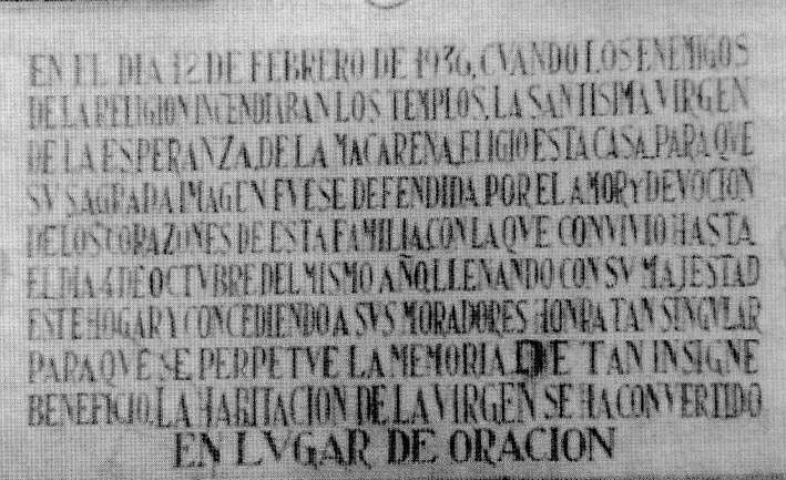 17 de Diciembre de 2006 Mañana es Su Santo y muchos la veran, como la estamos viendo desde el pasado viernes en todo Su esplendor de Reina de la Tierra y de los Cielos , pero quizás este año sea un año especial. Pues Ella. mañana estara alli gracias a que hace setenta años hubo unos hombres y una mujer que se jugaron la vida para que estuviera alli y que la libraron de las llamas de las hordas marxistas, frente populista y cuyos nietos de aquella epoca, no necesariamente de los mismo hechos , tras la invocación no del Espiritu santo, sino del espiritu republicano en plena inmaculada te lanza un manifiesto laicista Posiblement Ella, mañana no olvidará la mirada de miedo de Manuel Gamero y Victoria Sanchez Contrera, limpiadora del templo de San Gil mientra la ocultaba en su humilde casa de la calle Escoberos envolviendola entre sábanas , para que no corriera la misma suerte que tantas imagenes y templos en Sevilla Ella no olvidará, en Su memoria historica , como sin procesiones extraordinarias sino en una furgoneta la trasladaban y sacaban de su refugio secreto de la calle Orfila , bajo el mas riguroso secreto de hombres como José Ruiz Ternero, Domingo de la Torre y Antonio Roman Villa .- Ella recordará como veía la luz de Sevilla no entre sus varales y bambalinas sino entre las rendijas de un humilde cajón de madera y oia como se extendia el rumor de que estaba oculta en el mausoleo de Joselito .- Ella esta noches junto a los hermanos que hacen turno de vela en su Besamanos del siglo XXI, seguramente recordará los rostro de aquellos otros hermanos que en 1936 , hicieron guardias nocturnas y diurnas mientras efimeramente estaba en San Gil, para protegerla de ningun atentado .- No olvidará la visita en su exilio del general Millan Astray , no olvidara como se entero que se habia uqedado sin Su casa la noche de un 18 de Julio que le obligo a vivir en la diaspora de su barrio y trasladarse a la Universidad que entonces estaba en el Valle .- Quizás el equipo de priostia macareno, este año, precisamente este año, que nos quieren vender la burra de que los verdugos anticlericales, fueron seres puros que no rompieron un plato; en estos momentos de neorepublicanismo , de palmario revanchismo de perdedores guerracivilista que quieren dar al traste con una ejemplar Transición ; deberian haber rescatado ese humilde cajón, esa humilde toca y de esa manera haber montado el altar de besamanos macareno de este año , como hace sententa años, para que la generaciones presentes , recuerden lo que hicieron generaciones pasadas y no lo repitan generaciones futuras .- No, no es casualidad que hoy la Madre de Dios este donde esta y como está, fue gracias a la fe, a la devoción, al arrojo, a la valentia , a la determinación de unos pocos , que nosotros hoy los cofrades catolicos sevillanso parece como si nos acomplejara recordar estos dramáticos tiempos en que fuimos impia e implacablemente perseguidos y que parece que empezamos de nuevos a sentir esa inquitante sensación Esta es la otra memoria historica , que los rojos laicistas darian lo que fuera por no recordar ,"cuando los enemigos de la religión incenciaba templos " por lo que deberia haber colocado , en algun lugar del Besamanos esta lápida de la calle Orfila num 6 :