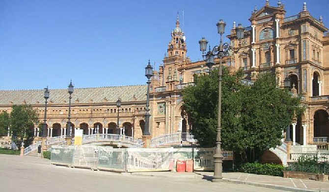 La Plaza de España, nuestro "Museo Ceramico al Aire Libre", en un proceso de mas que urgente y necesaria restauración actualmente interrumpida,¿ definitivamente ? llena de vallas con xerigrafias de "esto lo estamos arreglando", pero lo dramaticamente cierto, es que alli no hay nadie y solo han dejado , el trabajo a medio hacer y los restos de materiales .-