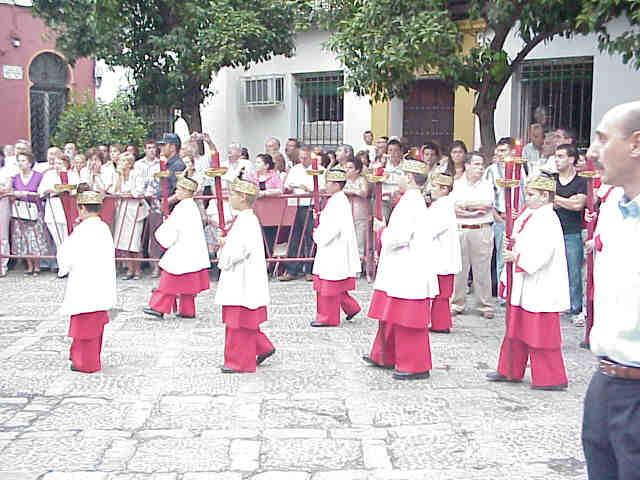 Los violines como las bicicletas son para el verano. Nuestra Banda Funcionarial de Sevilla cada año nos deleita con una excentrica novedad, como la inclusión en este año de violines, que para poder escuchar sus "solos" era requerido un silencio sepulcral del pueblo sabio y soberano, con la campanas al vuelo de la Giralda ni les cuento.- Gracias a su director hemos comprobado lo que ya sabiamos que los violines no fueron inventados para acompañar musicalmente un cortejo procesional en la via pública |