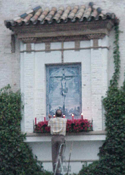 El numantino esfuerzo por mantener encendidas las velas del retablo del Cristo de la Misericordia de la Hdad de Santa Cruz en una fresca mañana de Agosto con un ligera brisa