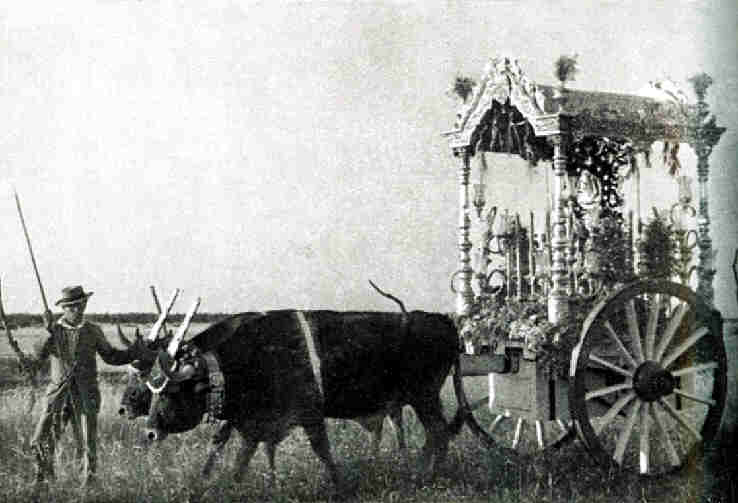 21 de Mayo de 2007 Hoy Don Victor José Gonzalez Ramallo, nos hace una de sus habituales interesantes entregas Si la incorporación de la Hermandad de Triana hace casi ya dos siglos a la nómina de hermandades filiales supuso la apertura de la Romería y devoción rocieras al mundo urbano, la inclusión de la Hermandad del Salvador en 1951 inició el despegue definitivo del número de estas hermandades y su rápida expansión por las ciudades andaluzas y de fuera de nuestras fronteras regionales. También fue el primer caso de que un mismo municipio contase con más de una hermandad rociera, fenómeno hoy ampliamente superado en nuestra ciudad. Los comienzos de la Hermandad de Sevilla no fueron fáciles, y estando creada en la década de los treinta en la Parroquia del Salvador, sus reglas no permitían su participación en la Romería. La autorización de Palacio, finalmente llegó pocos días antes de la fiesta de Pentecostés de 1951 lo que obligó a improvisar una curiosa carreta rociera con el palio de tumbilla de la Virgen de las Aguas venerada en su misma parroquia como ya hemos ilustrado en una entrega anterior ( VER ). Tras el éxito de esta su primera Romería a la Aldea, la hermandad se propuso contar con una carreta propia para lo que contactó con el prestigioso orfebre Manuel Román Seco, enfrascado en esa época en la realización de la original corona y otros enseres para su Hermandad de la Candelaria. Manolo Román cumplió con los plazos del encargo y entregó a tiempo para la Romería de 1952 una elegante carreta de alpaca plateada. A diferencia de lo que hoy se estila contaba sólo con cuatro gruesas columnas sosteniendo un templete de perfil polilobulado del que colgaban numerosas campanillas que le conferían una singular sonoridad. Nuestra fotografía de hoy carece de ninguna identificación del motivo representado, pero la carreta se corresponde fielmente con la anteriormente descrita. En su interior luce el primitivo Simpecado que sería pronto sustituido por el actual. Con respecto a este primer Simpecado de Sevilla existe una cierta controversia sobre su autoría y fecha exacta de realización. Si bien fue presentado en el Salón Colón del Ayuntamiento en la Exposición de Estrenos de 1952 nuestra fotografía permite comprobar que se trata de la misma insignia que se utilizó en la primera Romería del año anterior. La versión más aceptada atribuye este primitivo Simpecado al Taller de Sobrinos de José Caro, según diseño para unos de Fernando Marmolejo y para otros de Manuel Elena. De terciopelo verde oscuro contaba con bordados a realce en hilo de oro y aplicaciones de plata, contando en su centro con una imagen de la Virgen del Rocío de bulto redondo de Castillo Lastrucci, que curiosamente había realizado quince años atrás una imagen similar para la Hermandad de Triana. Este Simpecado sería sustituido pocos años después por el actual, obra igualmente del taller de los Caro y en el que la imagen mariana de talla sería sustituida por una de orfebrería con carnes de marfil realizada por Seco. Los bordados y aplicaciones del primitivo simpecado se utilizaron en la elaboración del estandarte corporativo que podemos contemplar cada Semana Santa en los cortejos nazarenos de El Amor y de Pasión, hermandades radicadas canónicamente en el mismo templo.